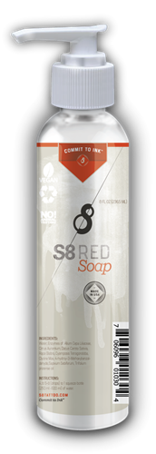 S8's RED Soap is a concentrated fluid that artists add to the water in their wash bottles. This fluid is loaded with plant enzymes and vegetable surfactants that lift away and neutralize oils, dead skin cells, topical bacterium and fungi- when applied to the skin, it gently cleans and prepares the skin for the tattooer to work. Additionally, RED Soap is a powerful astringent and alkaline skin wash that pH-balances the skin. All without dangerous petrochemicals. As all artists know, clean skin means better stencils, greater ink saturation, and faster tattoo heal out. And because RED Soap does not contain alcohol, you client will experience less pain and inflammation.